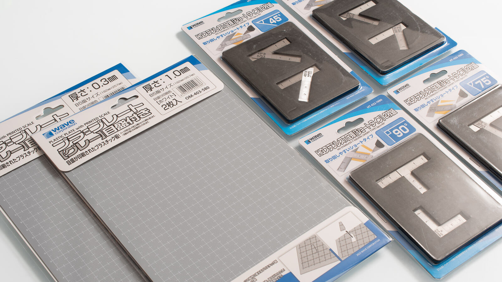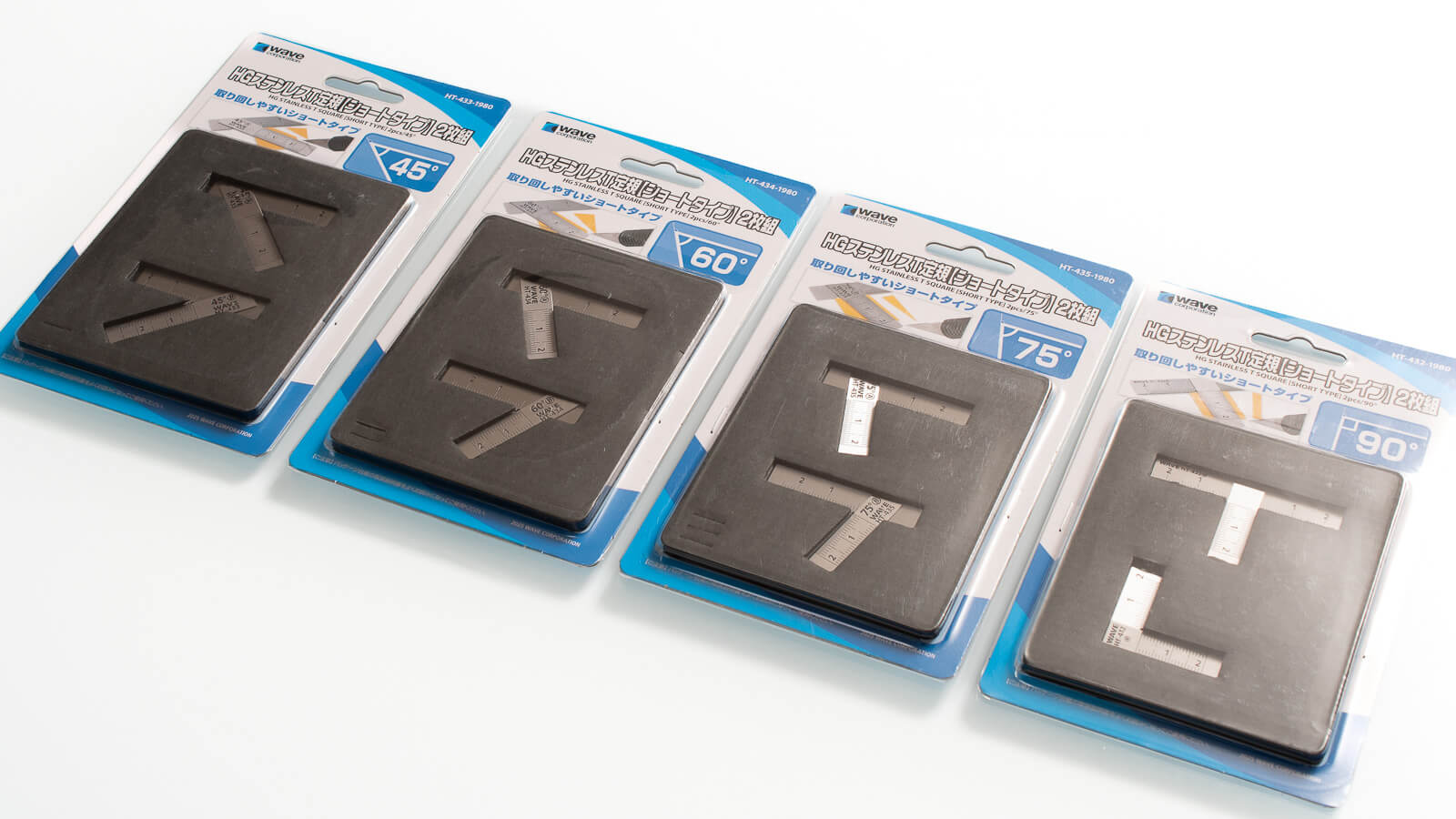 今回[ショートタイプ]としてラインナップされたのは4種類。しっかりとプラ板などにフィットする段付き仕様なので、45°〜75°の3種は対象形の2枚組になっています。単体で両用できる直角のT字はL型とセットになっているのも嬉しいです。