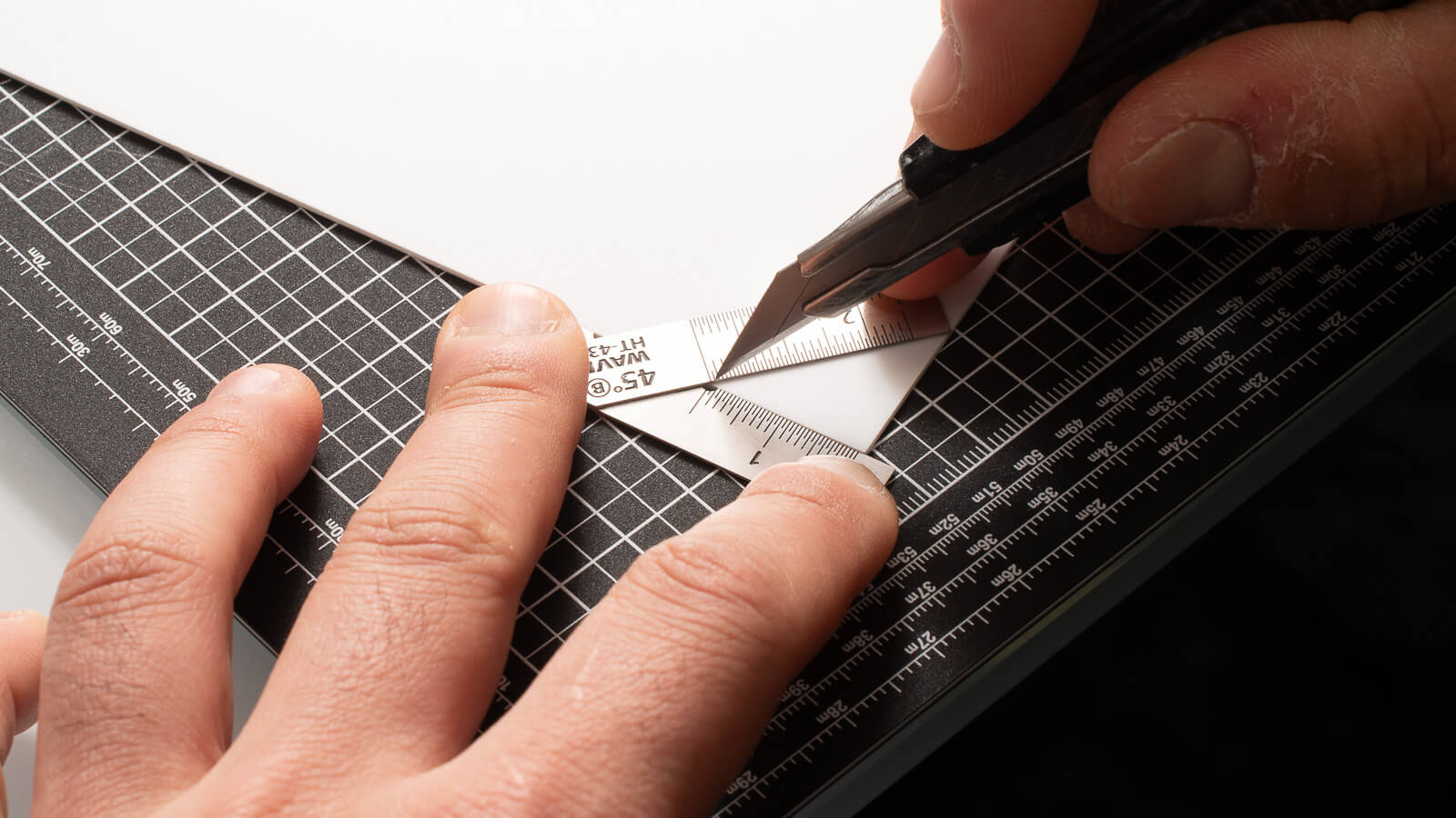 取り回しの良さはカットだけでなくスジ彫りにも活躍。まずは軽くデザインナイフでガイドの筋を入れます。
