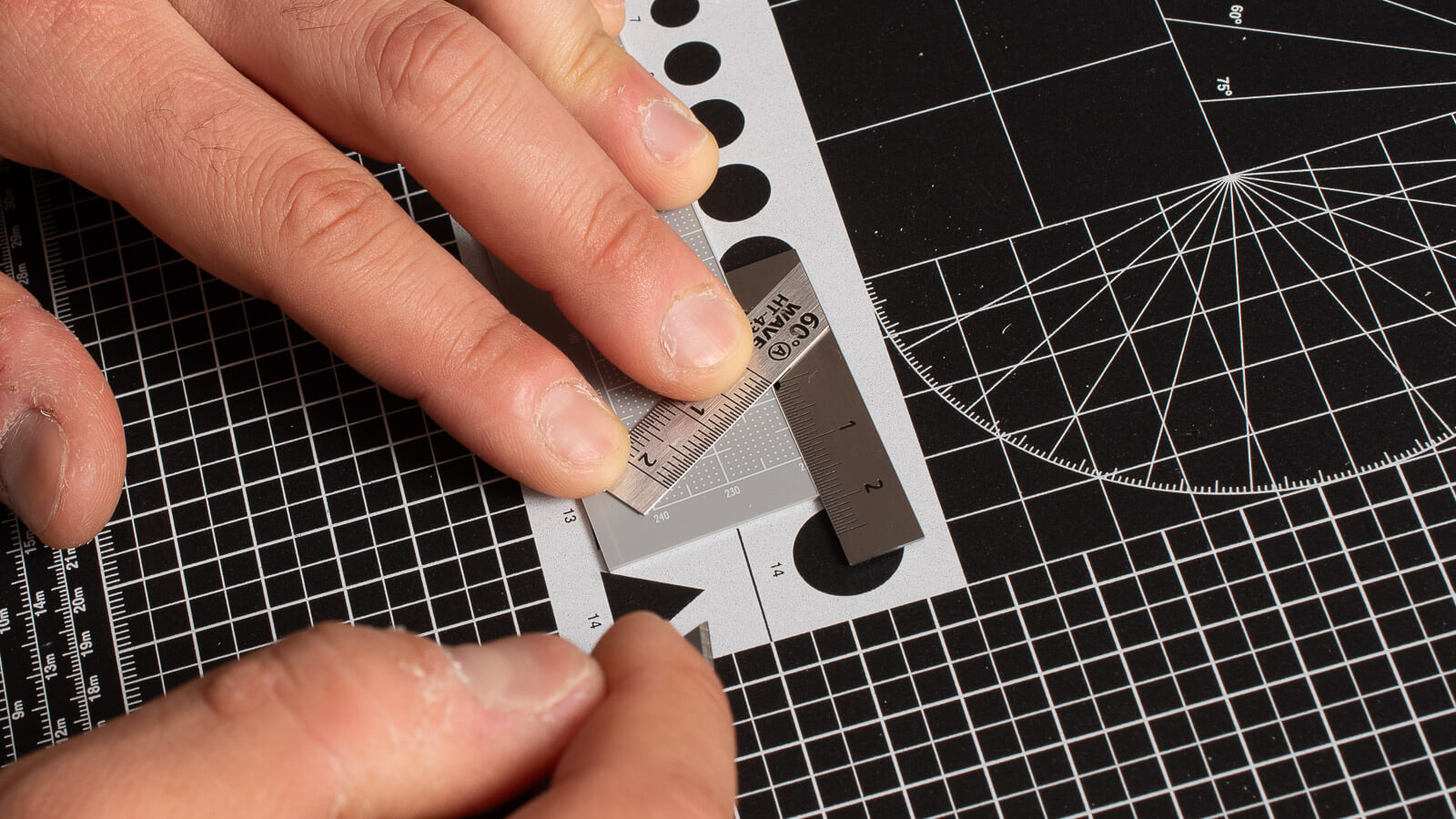 直角を当てて逃げ穴ゴール。プリントされた目盛のおかげでスジ彫りパターンのイメージもつけやすいです。