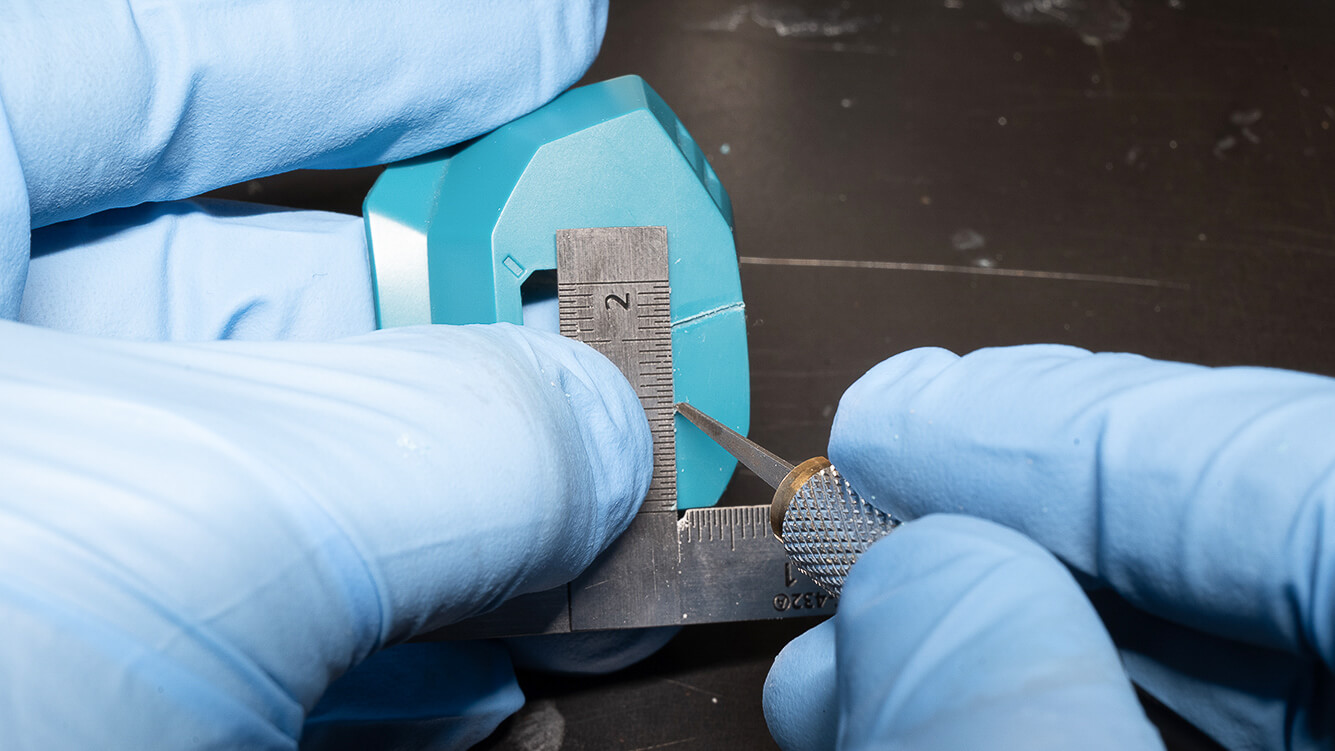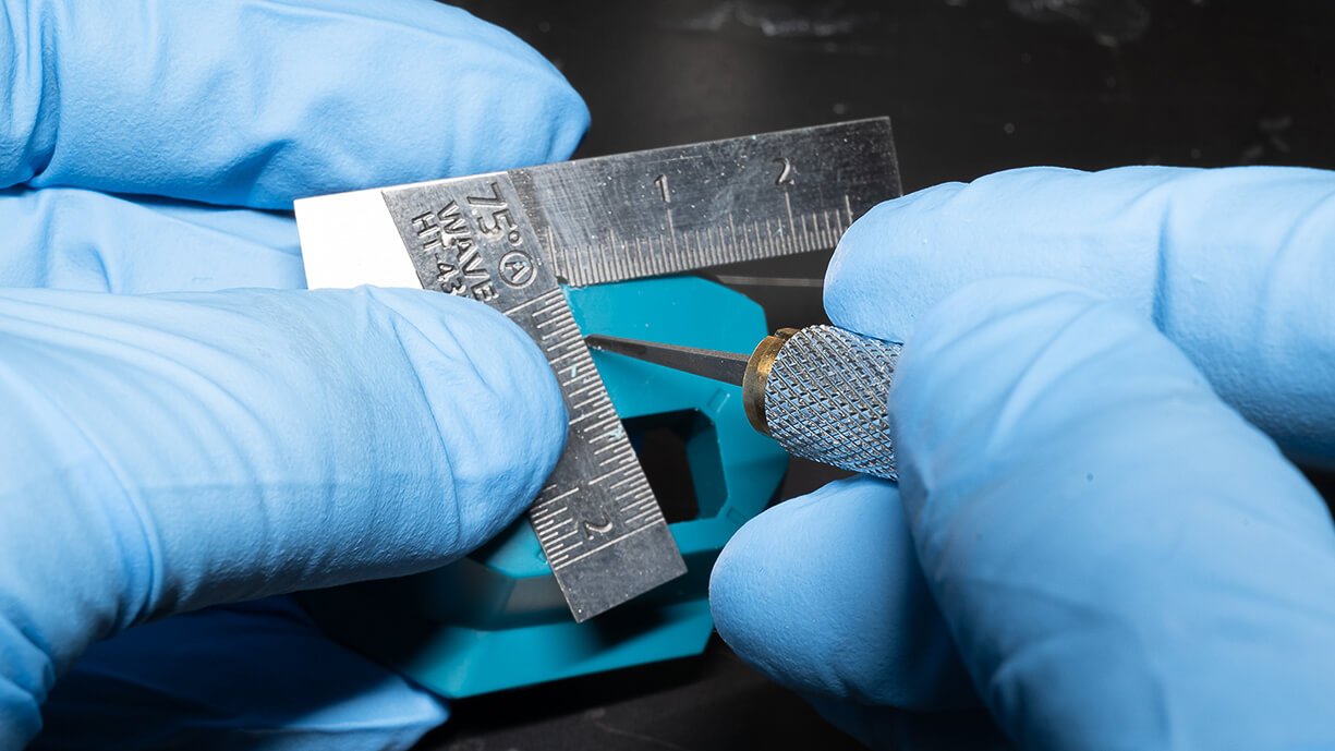これだけ取り回しもよくしっかりキープできるのならばチゼルでのスジ彫りとも相性バッチリのはず!ということで、キャラクターモデルのパーツでも定規スジ彫りを試してみました。スジ彫りはお馴染み「waveマイクロチゼル」です。考え抜かれた定規のサイズがパーツのサイズにもしっかりフィットしています。まずは外から開口部に向かって一筋。盤上にパーツを置いてガイドを当てるという従来のやり方だけでなく、このようにパーツに定規を当ててしっかりと持ち、手を盤上に置くことでより安定感をもって作業ができます。