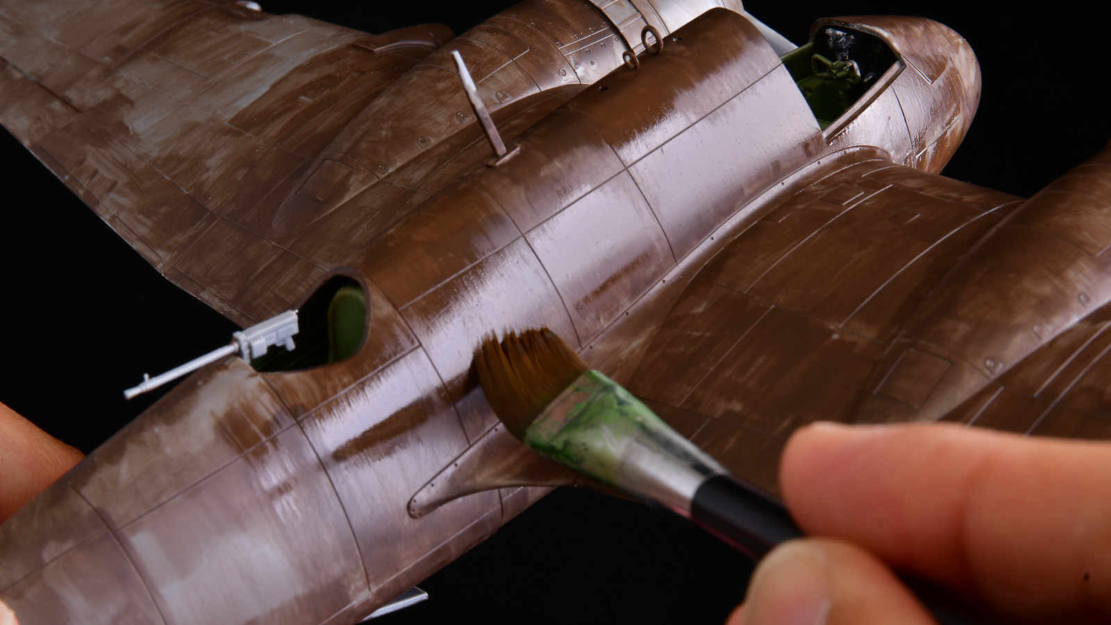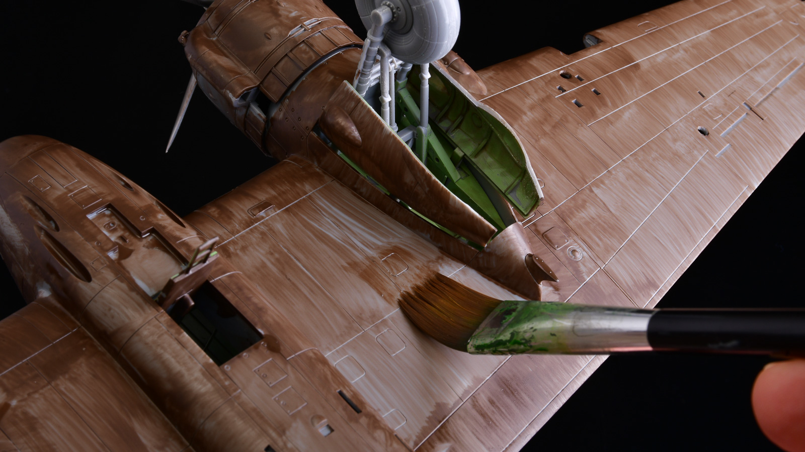 特に今大活躍しているのが平筆。僕はサーフェイサーのような下地色も筆で塗る時があります。このような時に、このデザイン筆の平筆を使うと、広い面を一気に快適に塗装していけます。ナイロン筆らしい反発力、筆の返りの良さが気持ちよくどんどん塗り進められます。