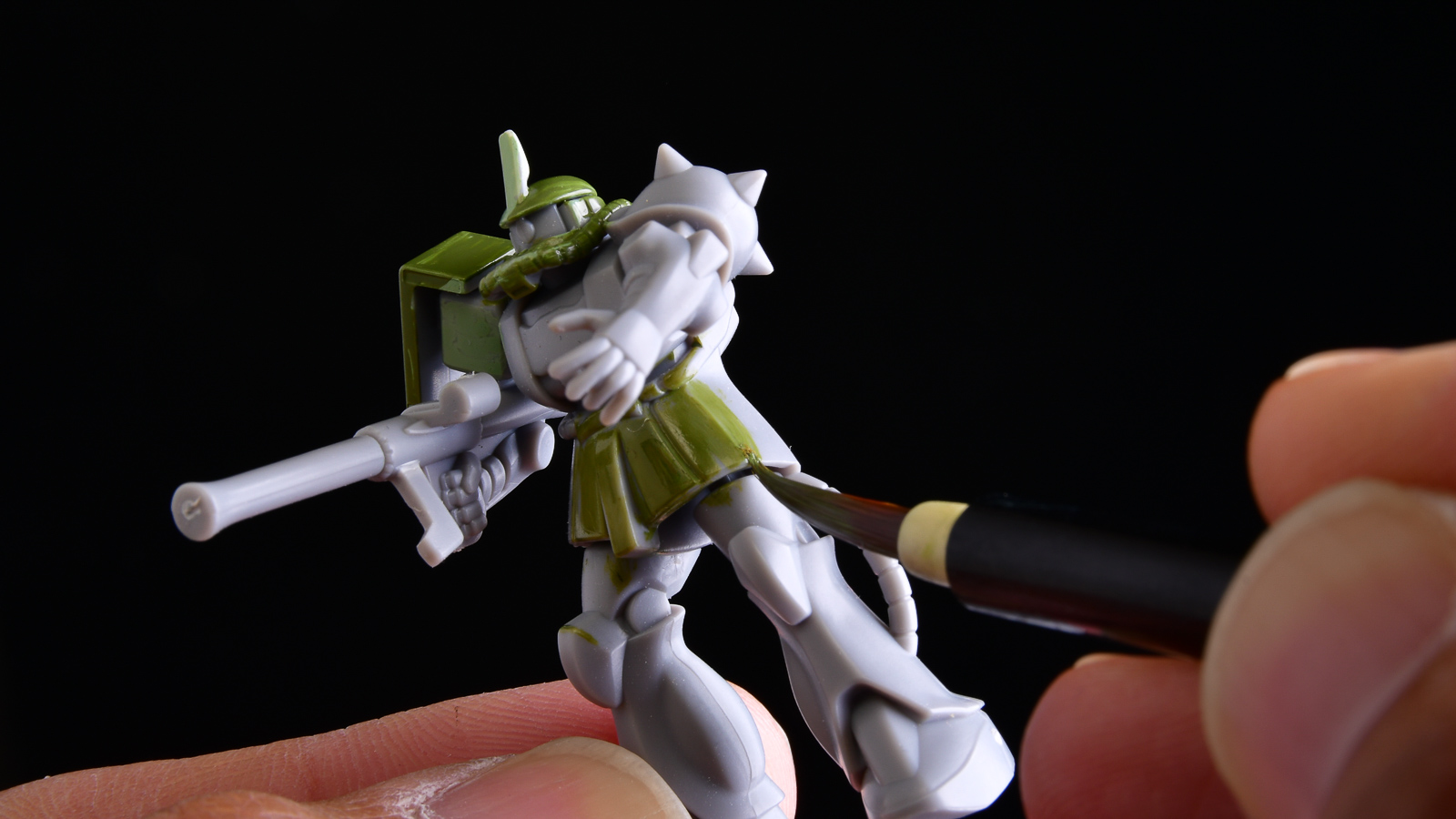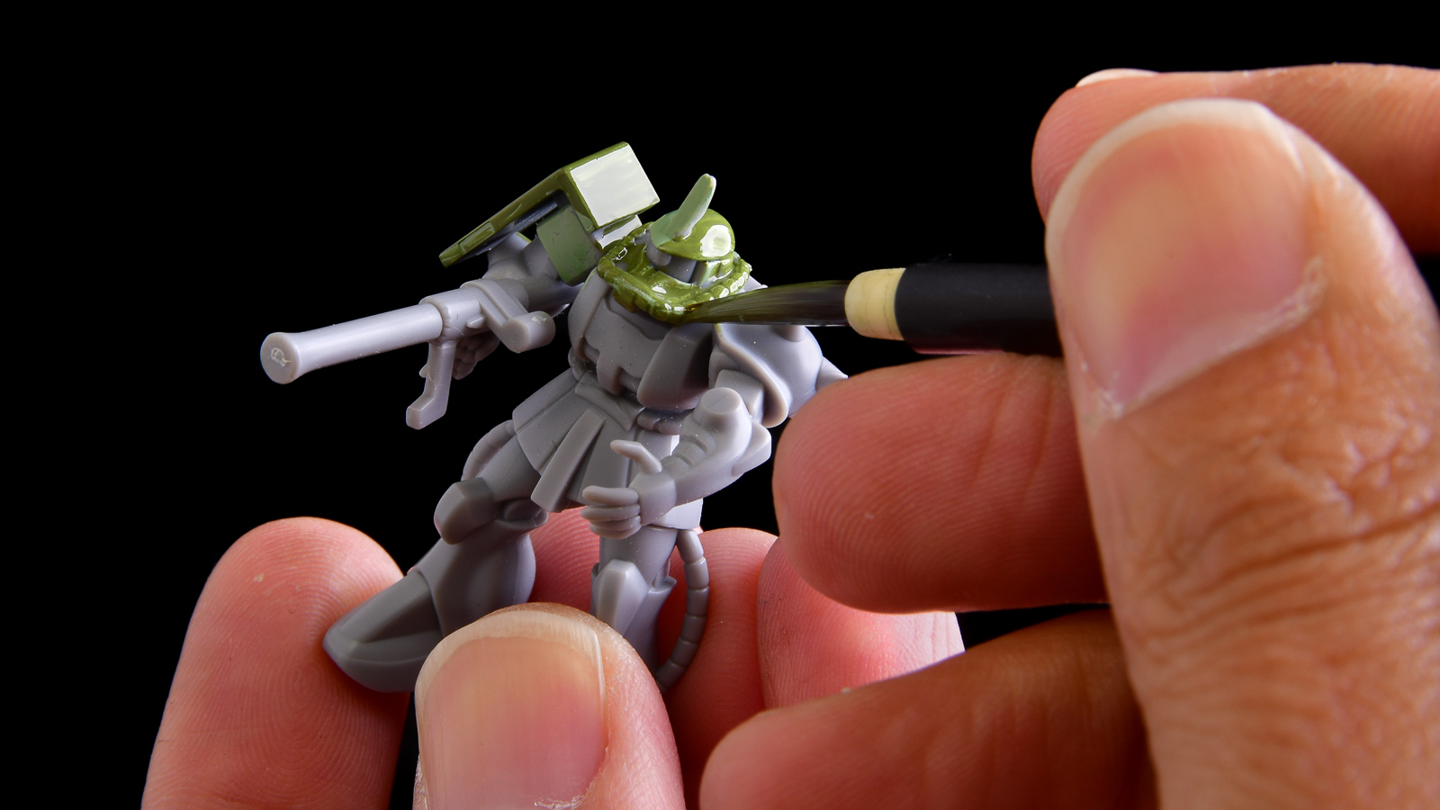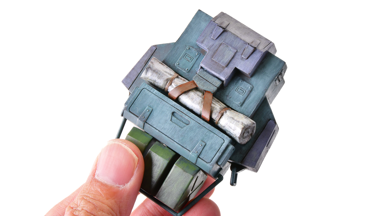 こちらのザックは、主にこの2本の筆を使って塗り分けました。ナイロン毛を採用しているため、模型用溶剤に対する耐性も十分。消耗品としてガシガシ使うのもよし、丁寧に手入れを重ねて、自分だけの“相棒”として育てていくのもよし。気軽に手に取れる価格ながら、模型塗装をしっかり支えてくれる頼もしい筆です。