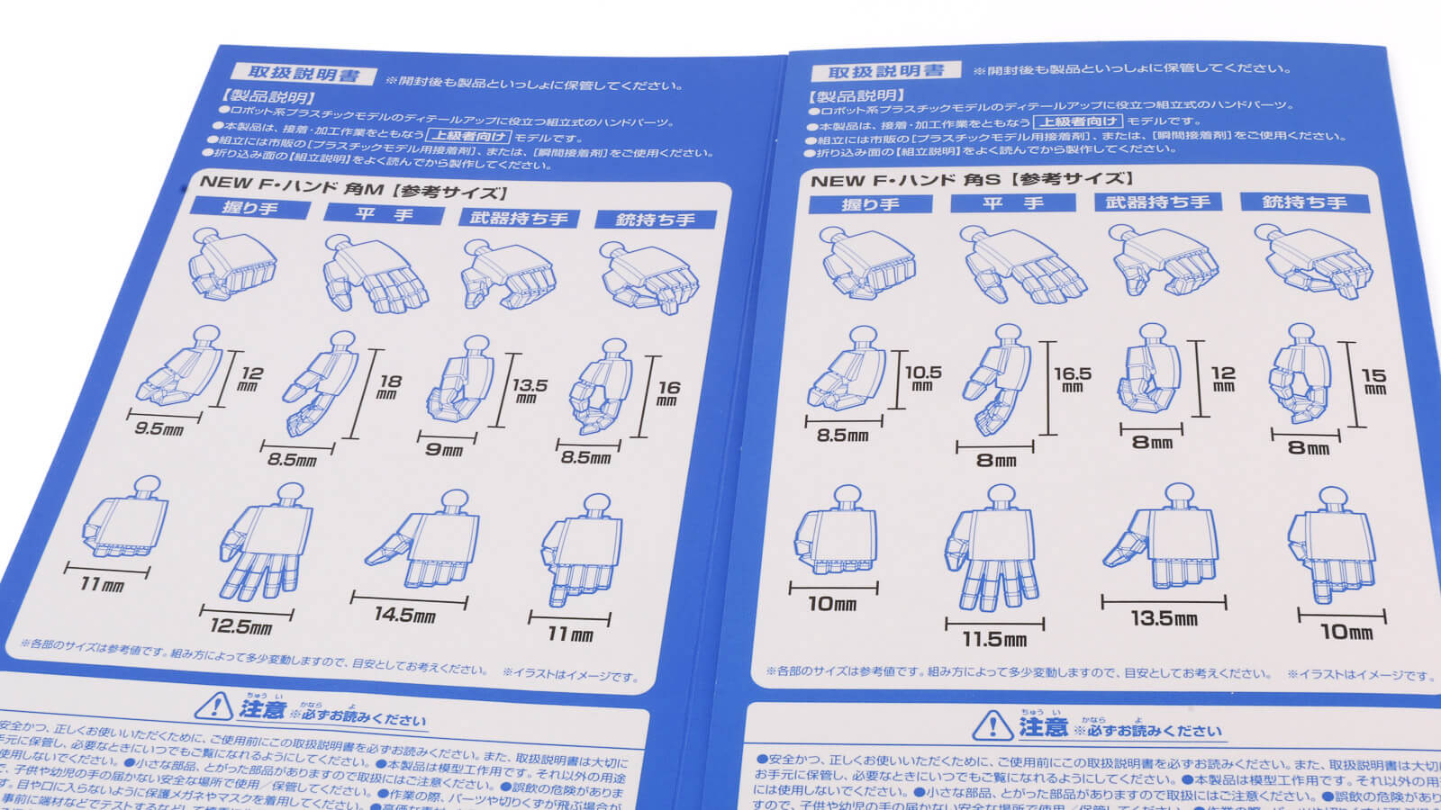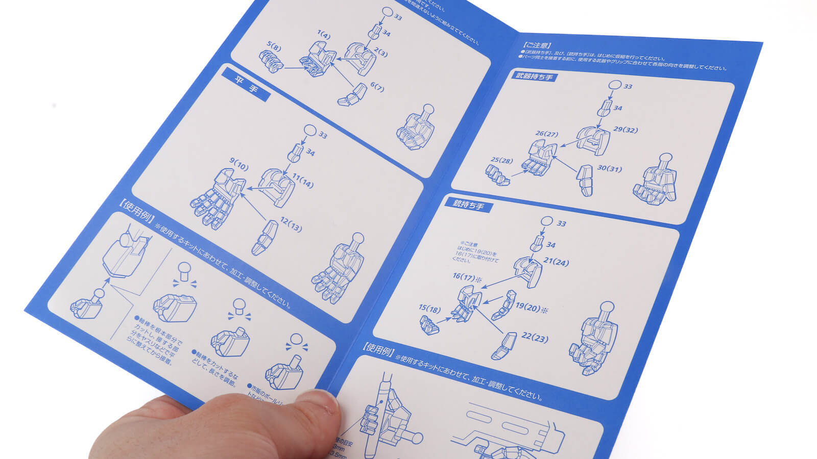 台紙は開いてみるとパーツの組み立て図になっています。握り手と平手のほかに、武器持ち手と銃持ち手があり、そのあたりの調整についても触れられています。
