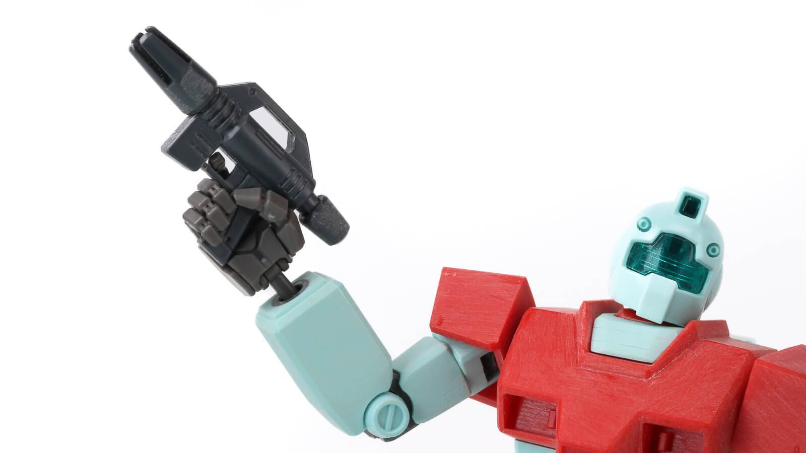 我が家のプラモデルに早速つけてみましょう。銃持ち手はしっかりトリガーガードを避けて人差し指をトリガーに合わせることができます。優秀……ではありますが、MサイズはHGUCジムくんにはちょっとだけ大きいかもしれません。
