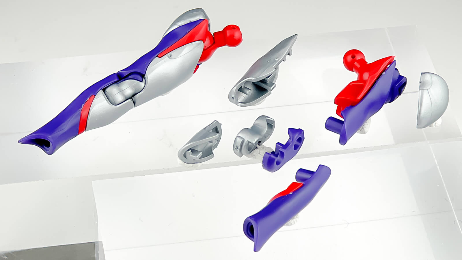腕の分割は青い部品がかろうじてその輪郭を感じさせる以外は、どれがどこにつくかが説明書なしではわからないくらいバラバラ。ちょっとしか露出しない肘関節の青と銀の色分けに至っては執念めいたものを感じて圧倒されてしまう。