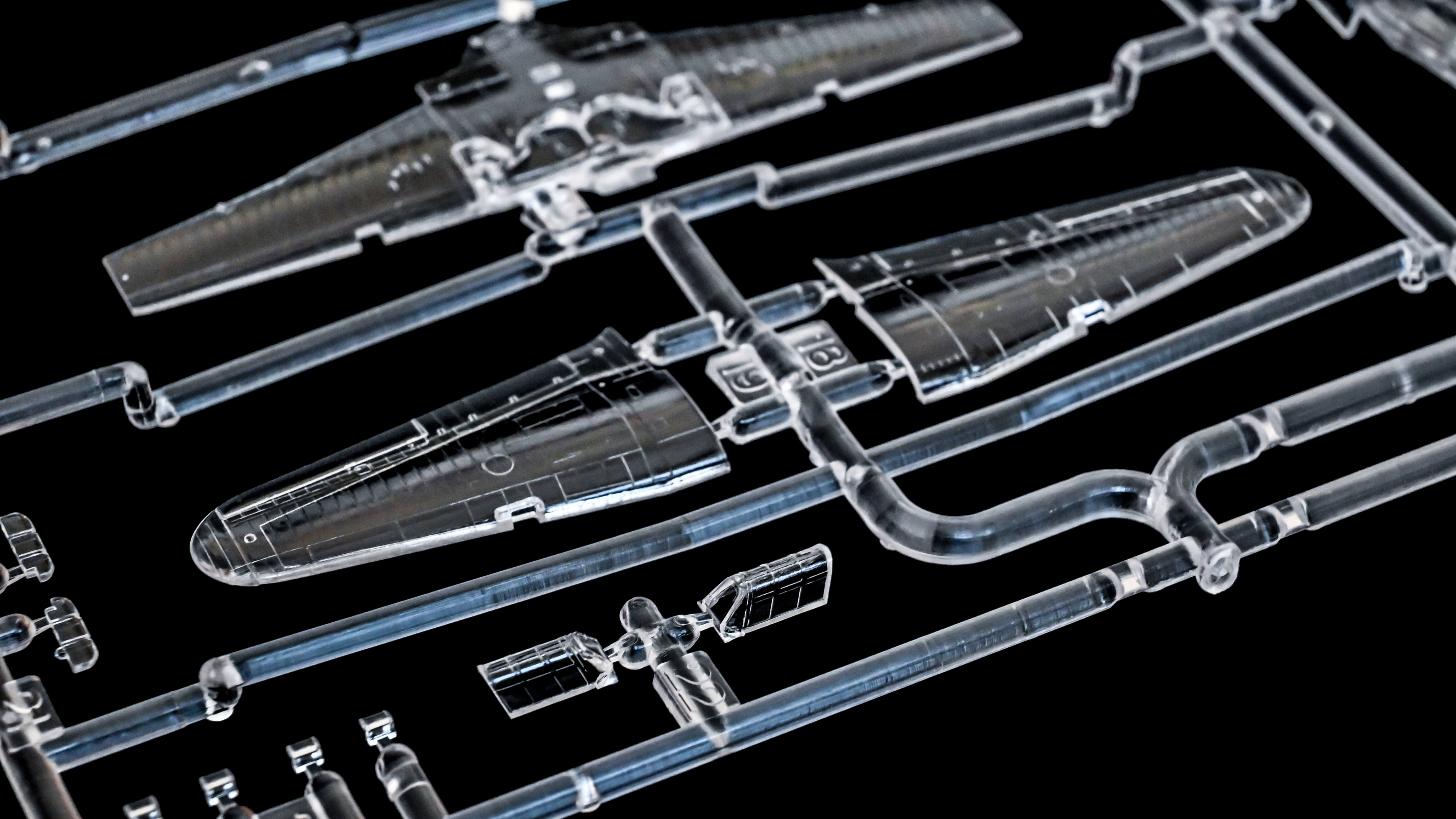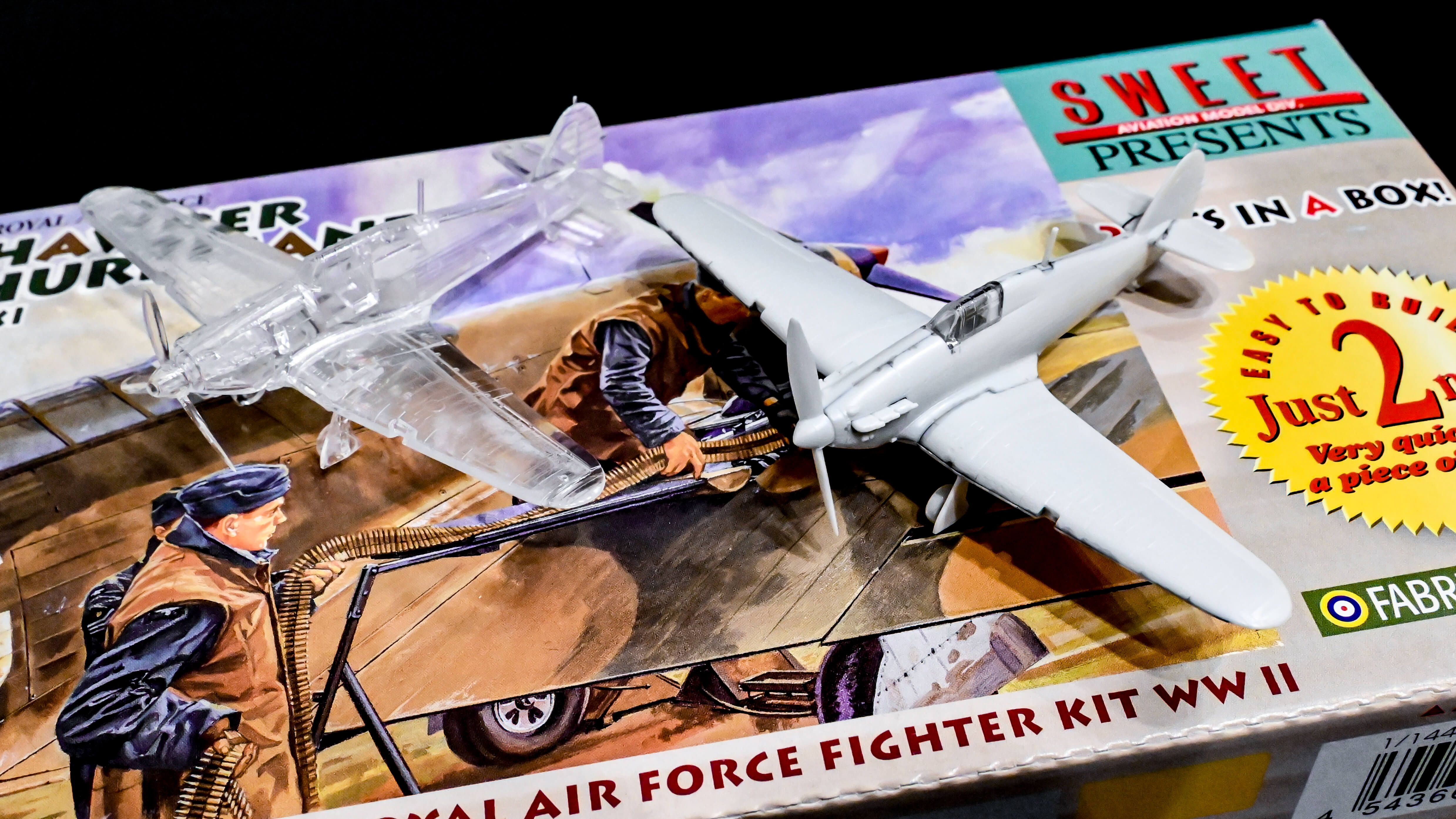 今回、気持ちを受け止めてもらうキットに選んだのは1/144の戦闘機ハリケーン。イギリスではスピットファイアに並ぶ救国の名機として名高い機体です。渋いアートのパッケージを開けると2機分のパーツがグレーと透明の成形色で入っています。早速組み始めようと思ったのですが、パーツ以外の内容物もとても豪華。思わず「もう祭りが始まってるじゃん!」と声を上げてしまいました。