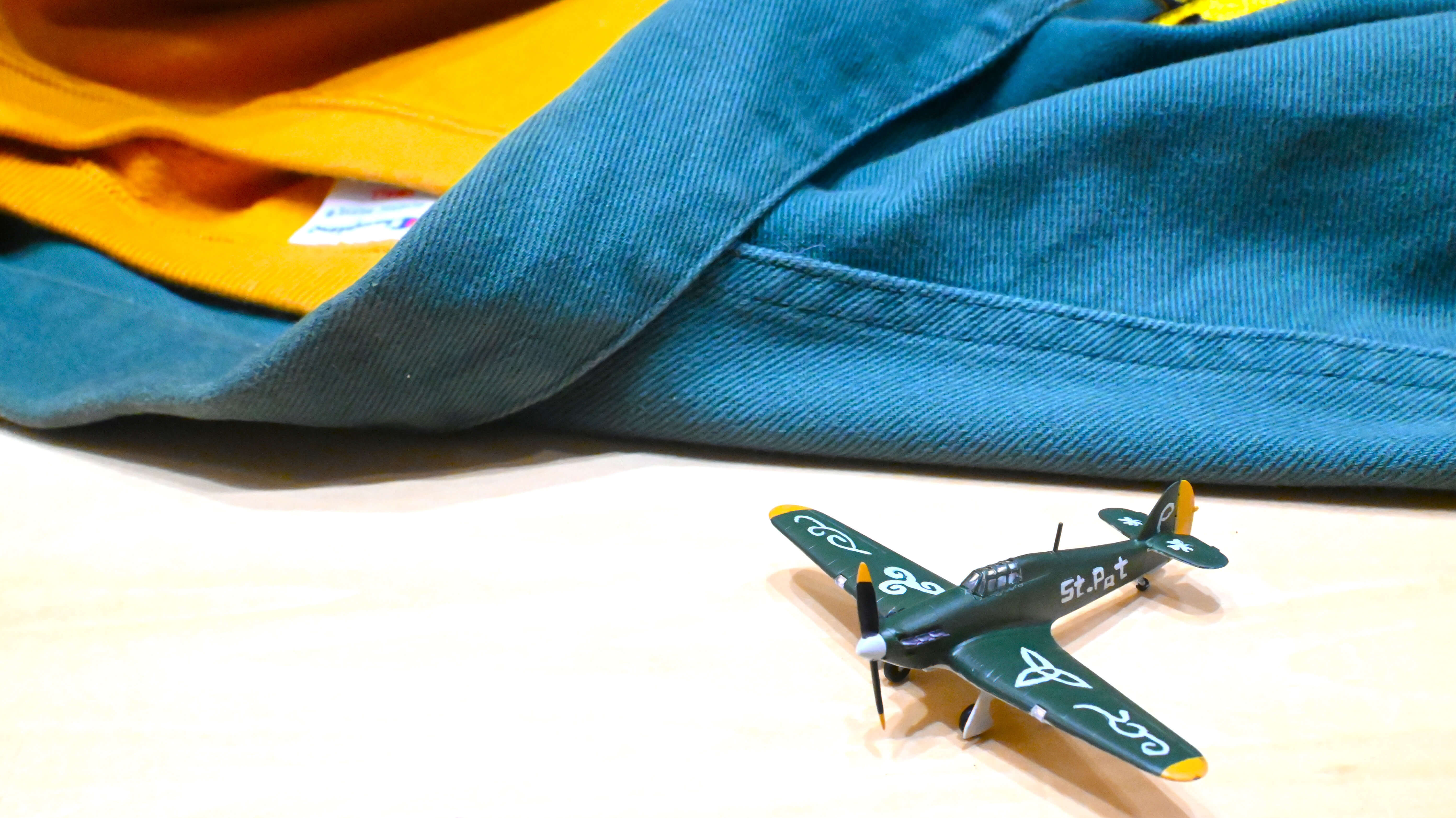 透明の機体は観賞用にキープしつつ、グレーのハリケーンに、緑を基本にした塗装をアドリブで施します。主翼にはアイルランドに伝わるケルト紋様をフリーハンドで描き込んでみました。もちろん線がメロメロになりましたが、お祭り用なのだから気にしません! むしろ「地元の趣味人がこしらえた」みたいなほっこりとした仕上がりになりました。