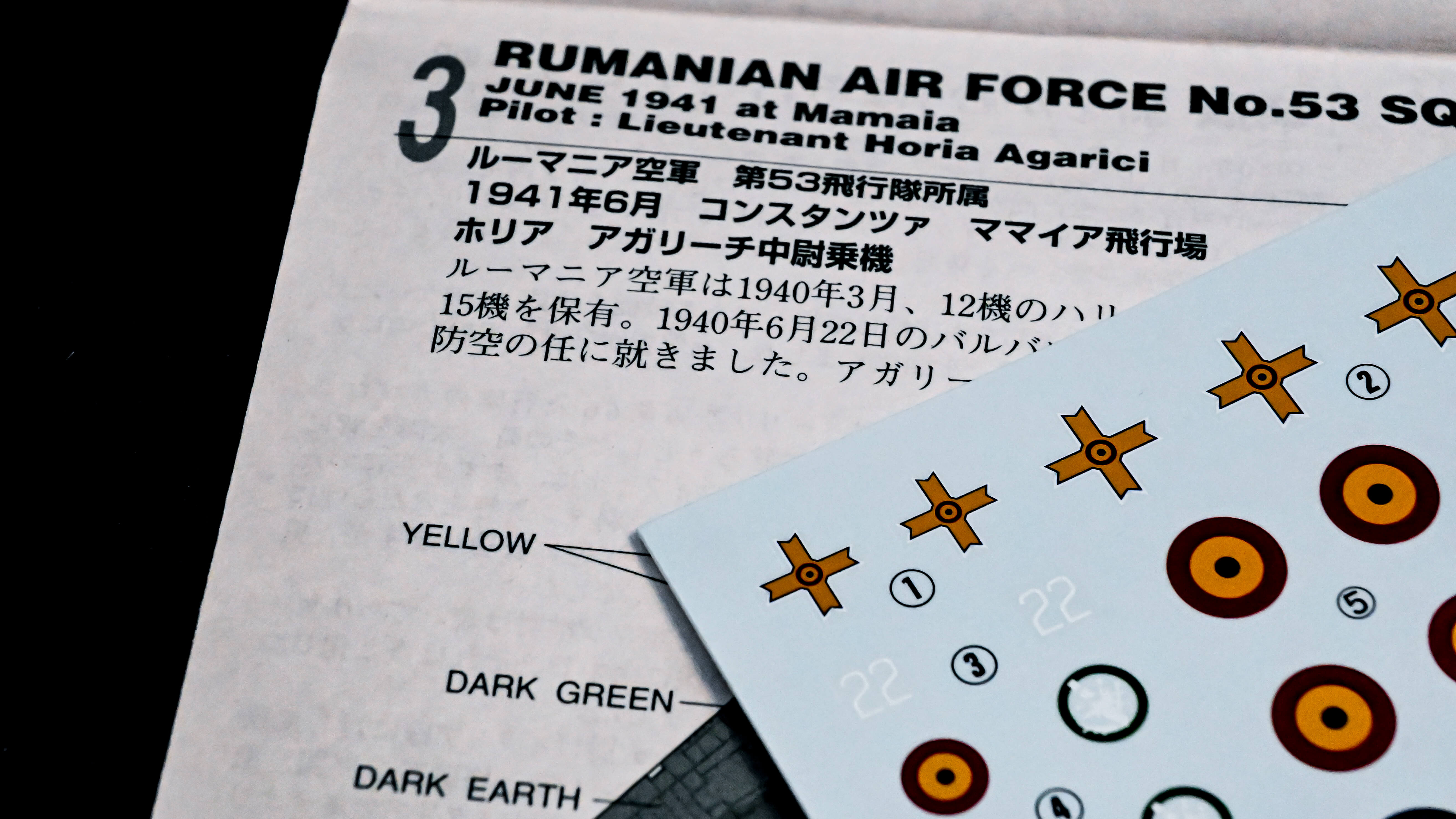 組立説明書の初めにハリケーンの機体解説がされているのですが、それだけでなく、裏面にも各国での活躍エピソードが掲載されています。さらに、塗装例はなんと8通り。しかも本場イギリスだけでなく、ベルギーやフィンランド、さらにはルーマニア空軍のものまで! 対応するデカールも各種ついてきます。目移り必至で悩ましいですが、幸いにも本キットは2機セット。1機はこのどれかで組むとして、1機は計画通り聖パトリックデー仕様にペイントすることにします。