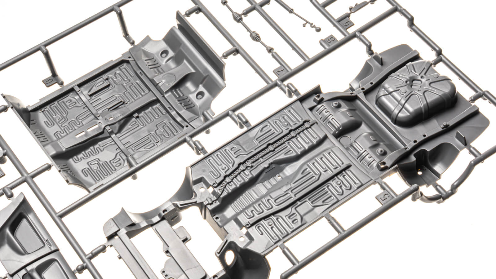シャーシにはエンボス加工と呼ばれる凸凹があしらってあるのに注目して欲しい。板っぺらにこの凹凸を加えることで強度を高め、その塩梅で走行時のキャラクターや静粛性が決まってくるという、自動車にとって重要かつ綿密な設計が込められている。そこにはトレンドやイズムがあり、AE92レビン/トレノの持つユニークさともなる。表には出ない、裏の顔といっていい。そのプレスのエンボス加工を妥協なく再現したのは「このクルマの決定版を出すんだ!」というハセガワの姿勢の現れでしかない。