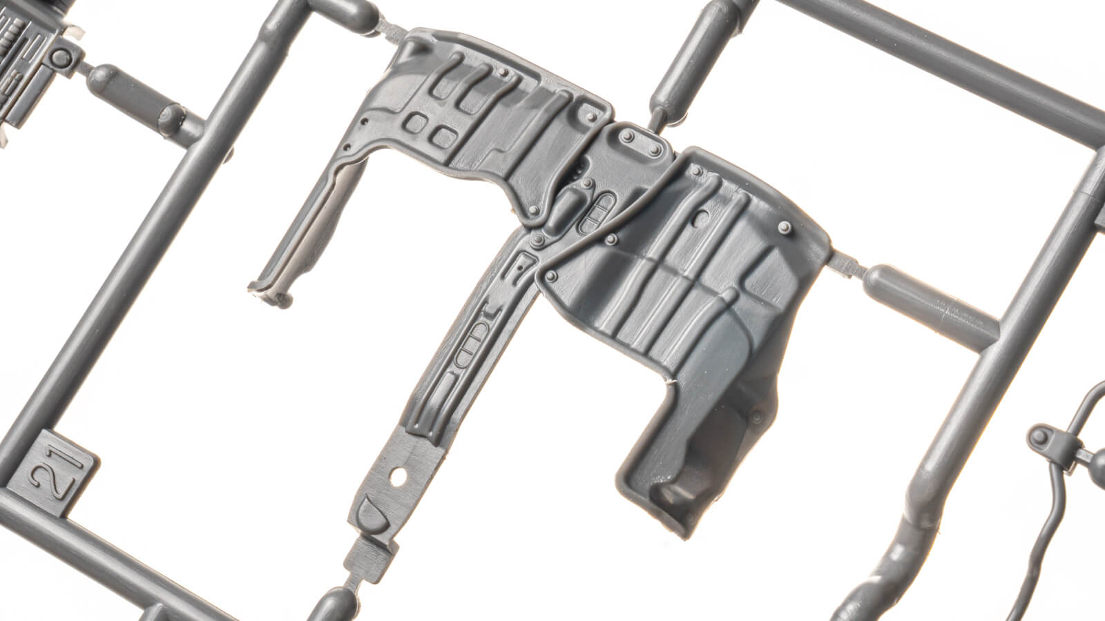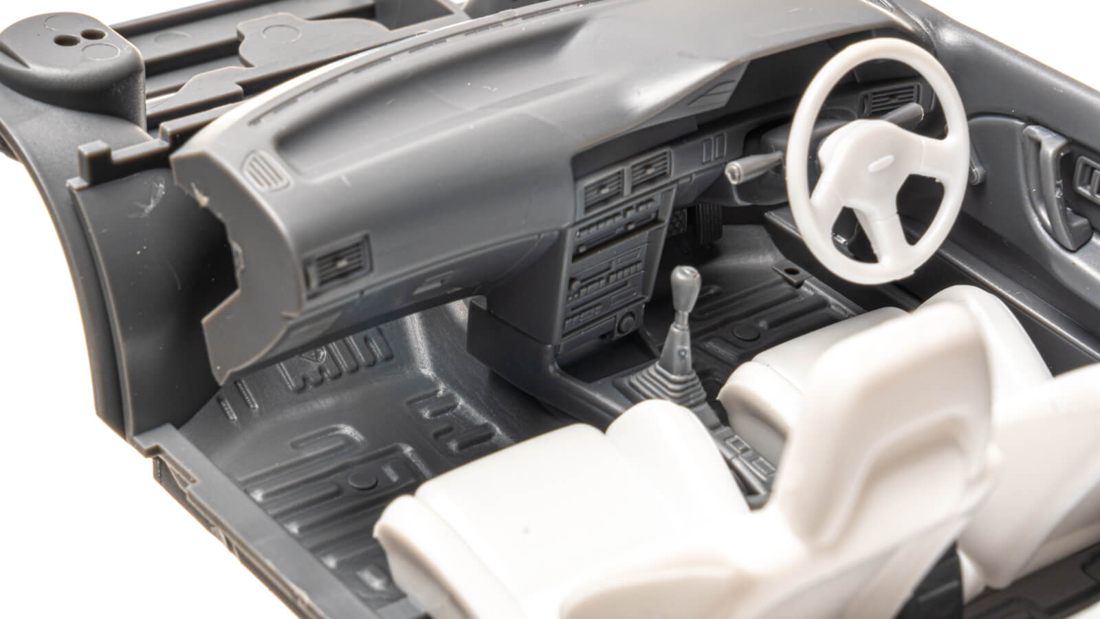 シャーシのプレスのエンボス加工の再現、パッと見ではまったく目に入らない箇所にもこの注力っぷり。そう、プレスの裏表を再現すべく、室内の床面にもプレスを刻んでいるのだ。そりゃあね、フロアのカーペットをめくったら見えますよ、このプレス。「軽量化だ!」つって、実車でそんなことしているのレーサーとか走り屋だけよ。ここをフラットな成形にしてフロアカーペットとしていても誰も文句言わない。大半のカーモデルはそう。ただ、このキットを組んだ本人だけが味わえる、喜びポイントなのだ。