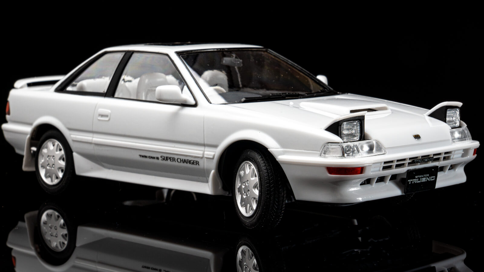 ハセガワのカーモデル最新作の箱を開けて、速攻で「彫刻に込められた気合が凄い!」と唸った。シャーシにびっしりと刻まれたプレスのエンボス加工からは「決定版を出すんだ!」という気概を感じる。今回発売された『トヨタ スプリンター トレノ AE92 GT-Z 後期型』は、正直リトラクタブルライトまわりの話をしようと手にしたのだが、いや、待てと。その前に2020年に完全新規金型を起こし、完全リファインを図ったAE92レビンのことを話さなくてはならない!