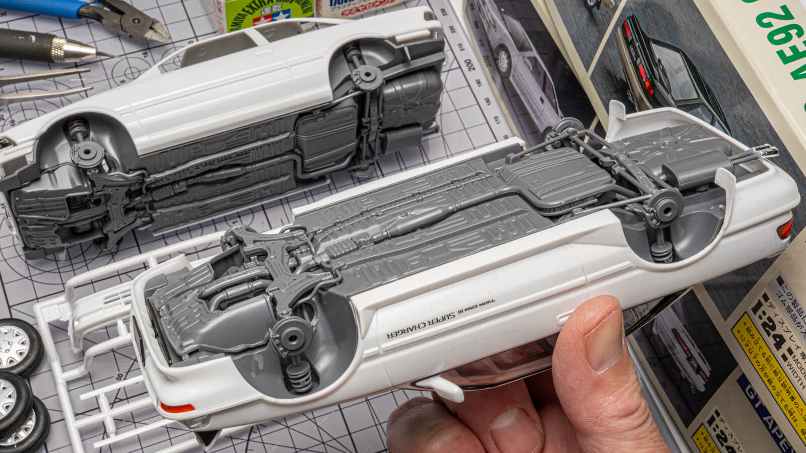 シャーシにはエンボス加工と呼ばれる凸凹があしらってあるのに注目して欲しい。板っぺらにこの凹凸を加えることで強度を高め、その塩梅で走行時のキャラクターや静粛性が決まってくるという、自動車にとって重要かつ綿密な設計が込められている。そこにはトレンドやイズムがあり、AE92レビン/トレノの持つユニークさともなる。表には出ない、裏の顔といっていい。そのプレスのエンボス加工を妥協なく再現したのは「このクルマの決定版を出すんだ!」というハセガワの姿勢の現れでしかない。