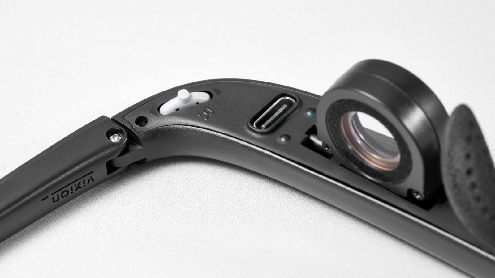 nippperで追いかけてきたオートフォーカスアイウェア、ViXionシリーズはその問題を「可変式の液体レンズ」で解決するかなり未来的なアイテムです。外部センサーが対象までの距離を測定し、その情報に基づいて液体レンズの厚みを変化させることで焦点距離を動的に制御する仕組みによって、ピント合わせという行為を機械に補助させるシロモノ。視力検査も処方も不要で、目の状態が変わればユーザー自身が再調整すれば使い続けられるというところも素晴らしいポイントです。電源は内蔵の充電式バッテリーで、USB-Cによる約3時間の充電で約15時間の連続使用が可能です。