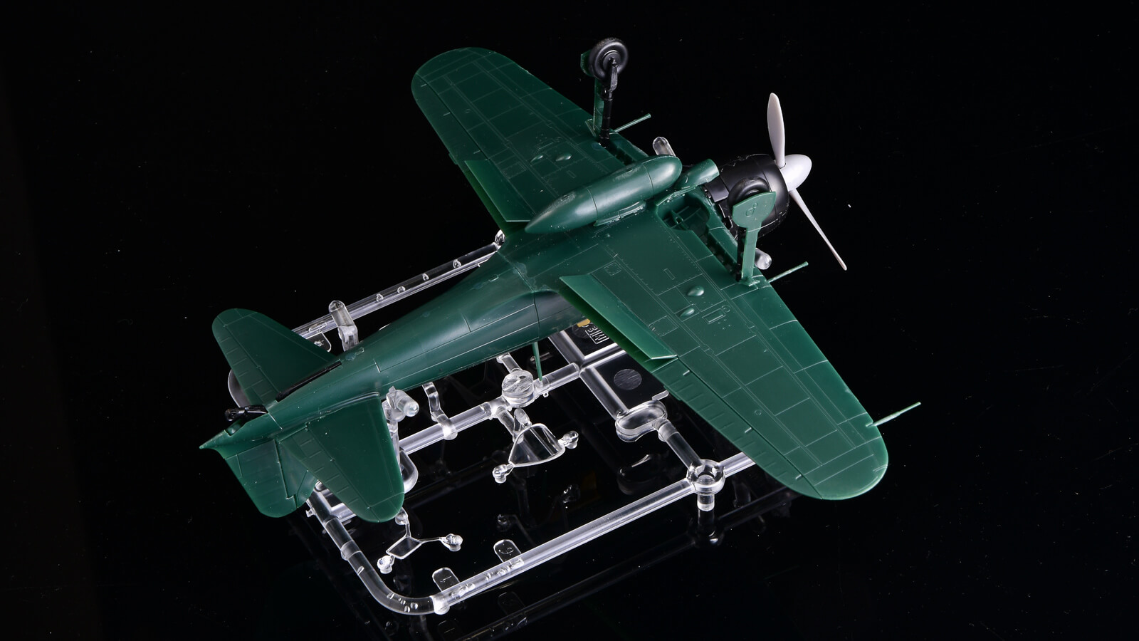 主翼がぐいっと上がっている特徴的なシルエットも、歪みなく表現されています。しかも中央ブロックを芯に主翼上面を一体成形しているので、下面を接着するだけで、自然と主翼のシルエットが決まる分割となっています。