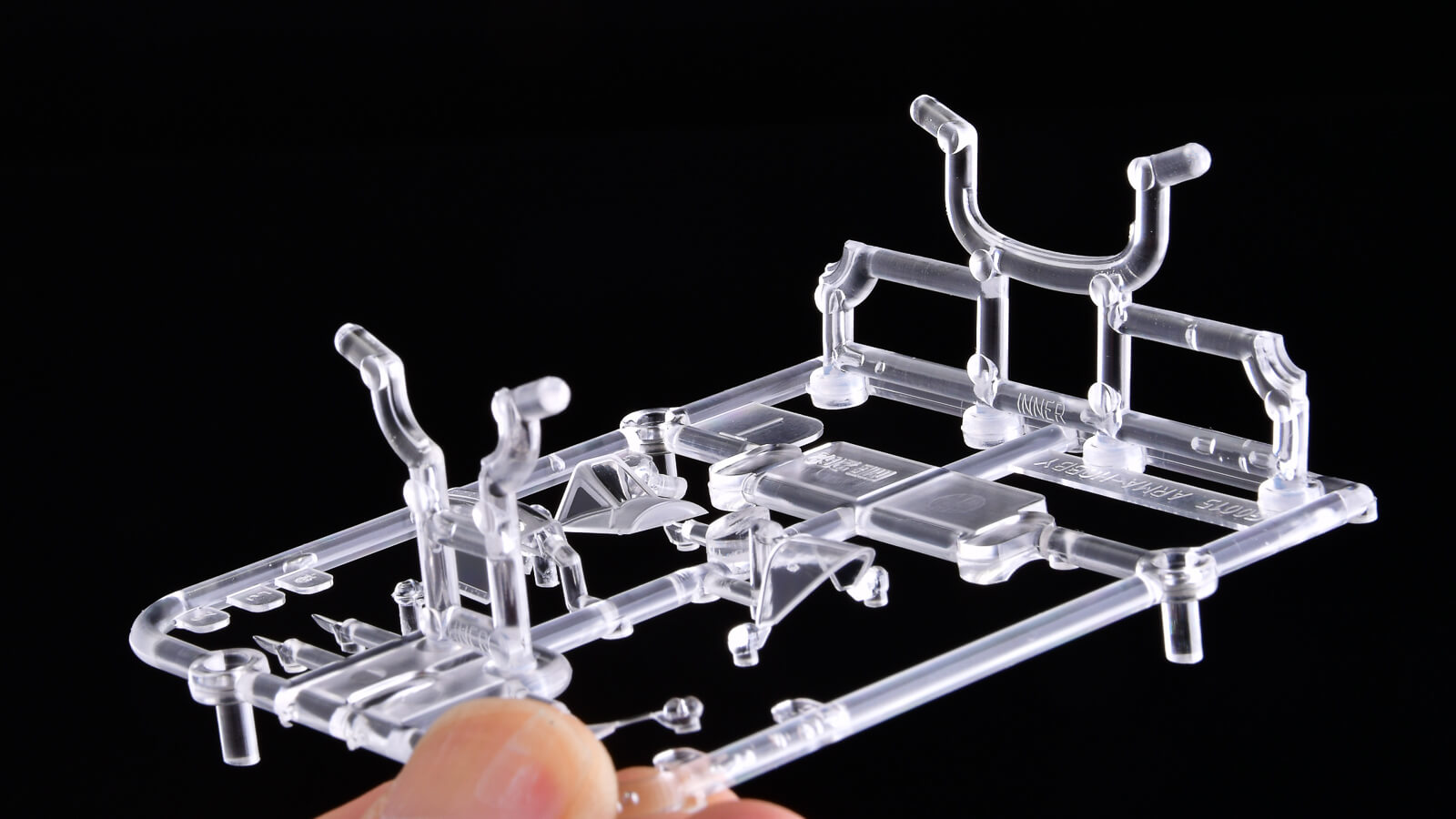 クリアーパーツの枠の両脇に、なんか刺股のようなパーツが付いています。これ、実は飛行機模型を作る時の治具になります。クリアーランナーに専用の穴があり、そこに刺股状のパーツをはめると完成します。