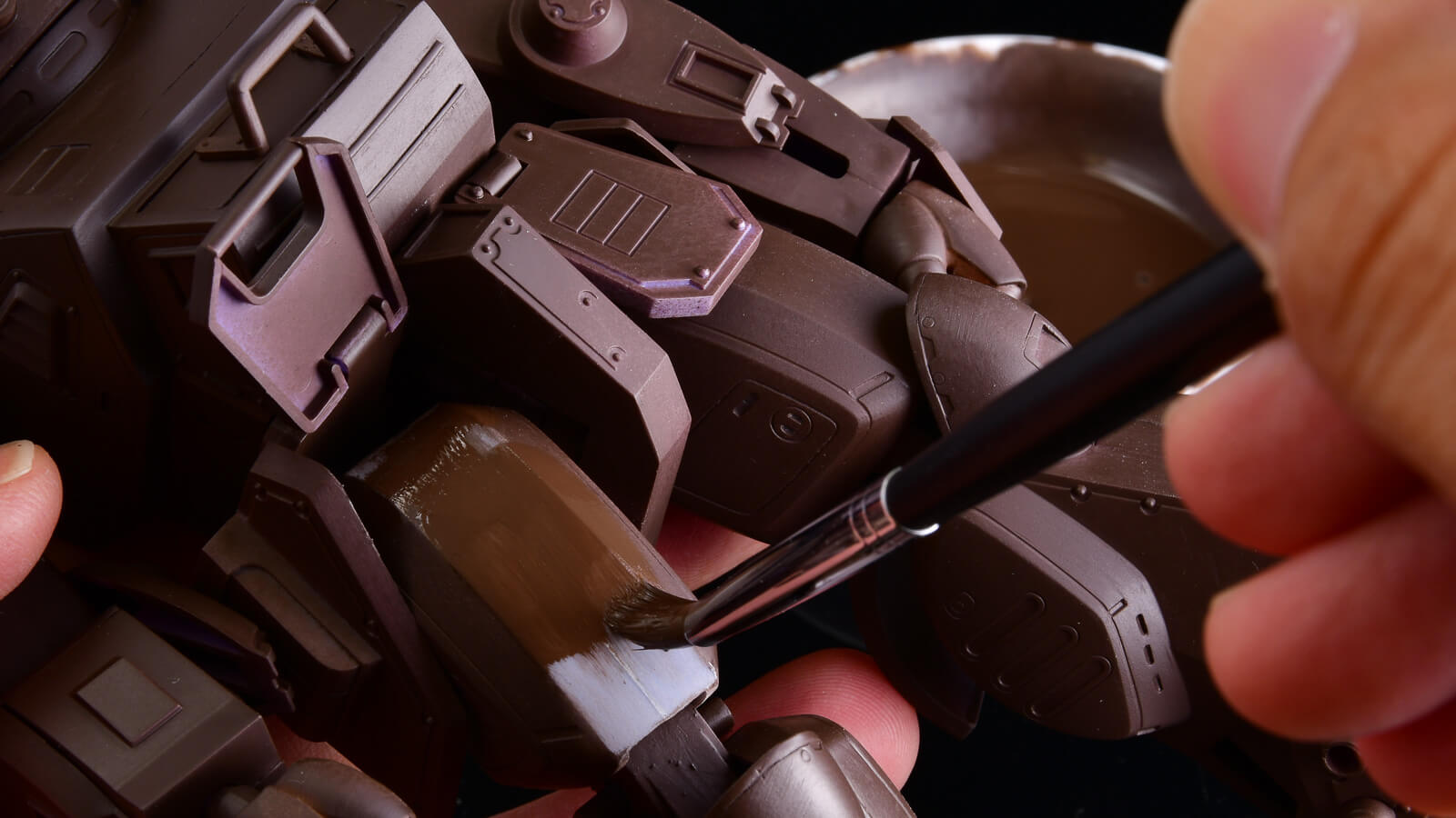 サーフェイサーのように頻繁に使う色も、この方法と相性抜群です。僕はマホガニーサーフェイサーと、ガイアノーツのメカサフヘヴィをよく使うので、100円ショップのお皿を使って専用のパレットを用意しています。使用する時は必ず刷毛で表面についた埃を落としてから、溶剤や塗料を足しています。