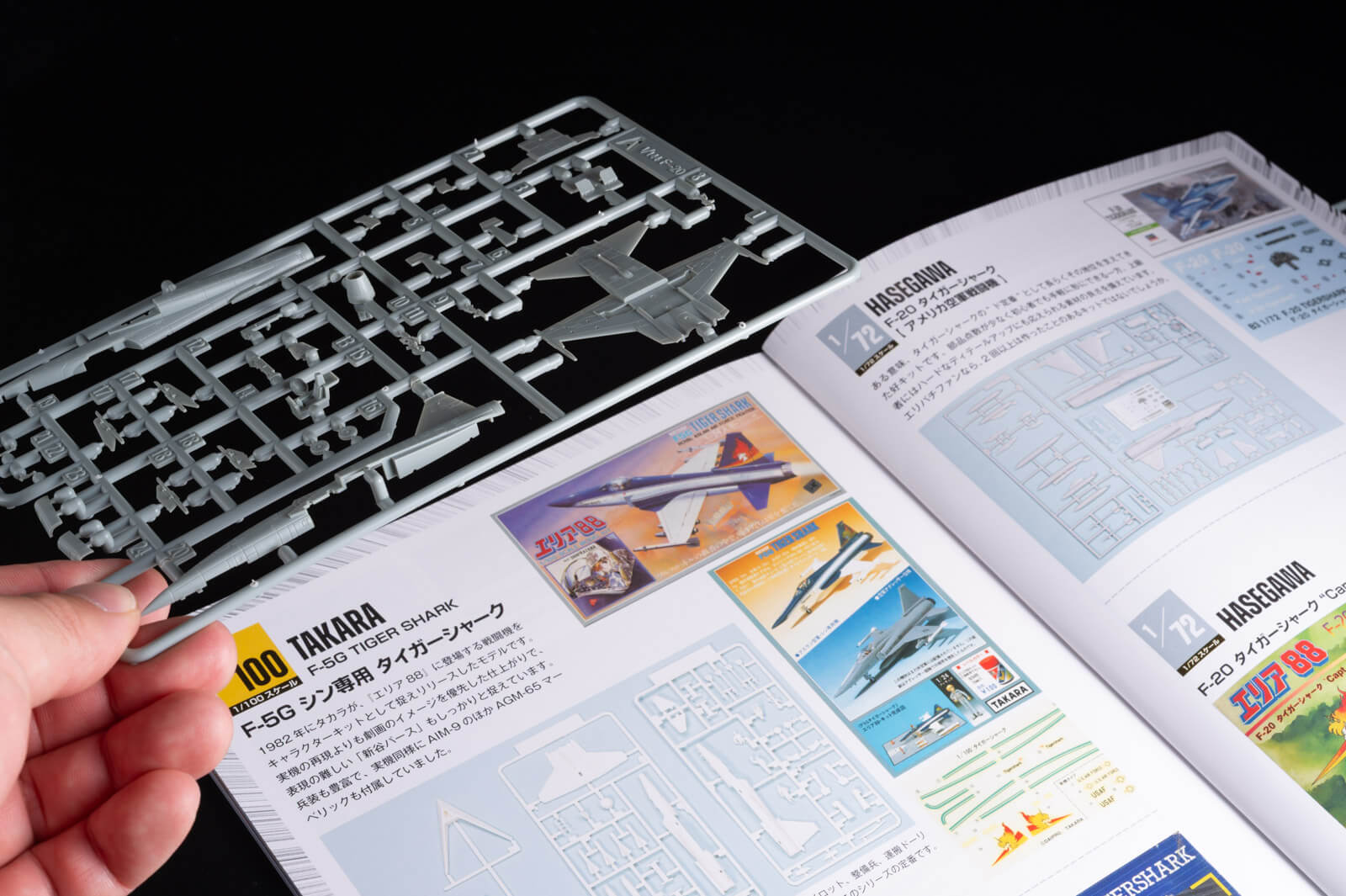 航空機マンガ『エリア88』に登場するタイガーシャークの魅力をしゃぶり尽くすかのように繰り広げられるタイガーシャークの作例、作例、作例……!群れ!どのページをめくってもタイガーシャークor新谷かおる(インタビュー)が現れるハイな書籍だ。その中でも興味深いのは、過去に7社のメーカーから販売された13点のタイガーシャークのプラモデルが掲載されており、しかも未組み立てのランナー状態で紹介されていること。面白いことに、どのメーカーもパーツ構成がそれぞれ違う。胴体、主翼、尾翼をどのような組み合わせで一体化し、分割とするのか。様々な手法と個性が理解できる。