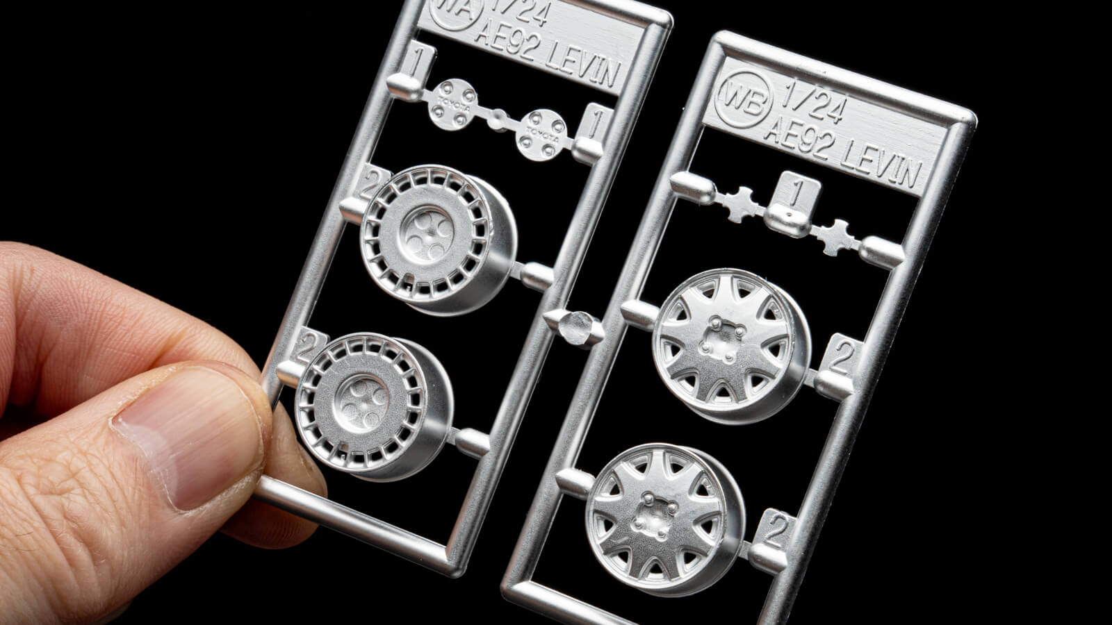 前回、シャーシの時にも「実車の部品構成にならってパーツの分割が成されている」と話したが、このアルミホイールのセンターキャップもまさにそれだ。一体パーツで難なく成形できるだろうに、わざわざの別体化。その拘りに思わずニッコリしてしまった。つや消しメッキ仕上げで上質な雰囲気になっているのも良い。