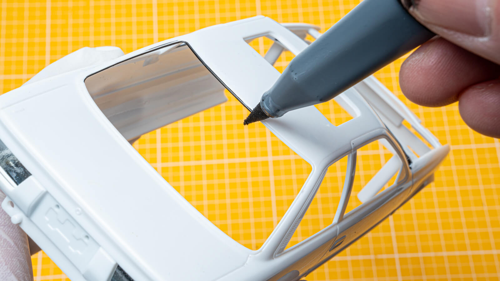 シャーシがテンポ良く組み上がるので、その勢いのままボディを仕上げてゴールしたくなった。ボディの白いプラ成形色を活かすのを基本として、ウィンドモールなどに水性ホビーマーカーの部分塗りを施した。モールはマーカーの腹でなぞっていくと均一な線を引いていけるのでオススメ。その他、リトラのライトユニット、フロントスポイラーの開口部の奥、ボンネットのエアインテークの内部を説明書の指示通りに黒く塗りつぶしておくと、白いプラモデルが途端にリアル感が高まるのでオススメの一手だ。