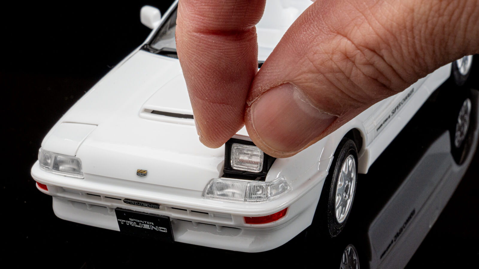 ハセガワの新規金型で完全リファインされたAE92レビン/トレノ。前回はシャーシ、下回りについてまとめて話をしたが、今回は『トヨタ スプリンター トレノ AE92 GT-Z 後期型』、通称『92(キューニー)トレノ』に的を絞って紹介していきたい。まず目を引くリトラクタブル・ヘッドライト。AE86から継承されるトレノらしさの象徴なのだが、法規制などによってこの世代が最後の採用となる。キットでは完成後も開閉できる可動仕様なのが嬉しい。リトラを上げるとボンネットのエアインテークと合わせて盛り盛りとなり、「足し算こそ正義」というバブルの時代性を感じて景気が良い。他の自動車メーカーも含めてこういうコッテリ濃厚なノリは絶滅したので、昭和終盤の様式美を味わえる機会ともなった。