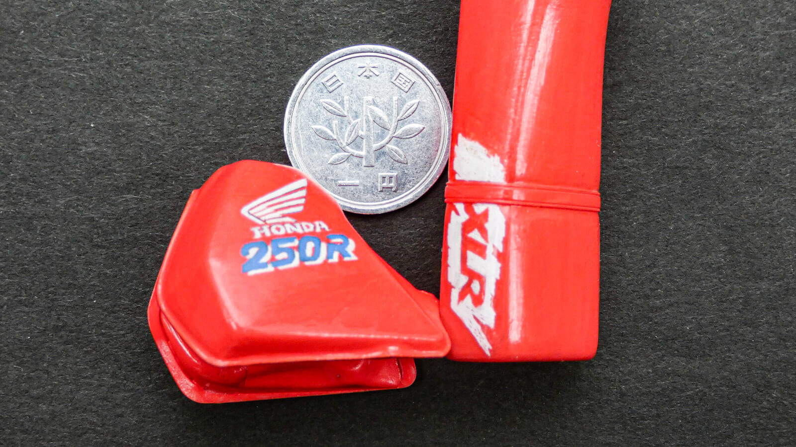 今は無き愛車再現、カラーリングが違うのはいいけどシートやタンクの文字が違う!デジタルでデカール再現、というのが遠すぎるのでアナログでなんとかします。デカールを貼り、上塗りラッカー系の防護のつもりでアクリジョンのクリアー塗布後、シートは「250R」をガイドに「XLR」に上書き、タンクの「ホンダウイングとロゴ」は白く上塗り、「250R」は説明書の文字を縮小コピーしたものを見ながら手書きしました。