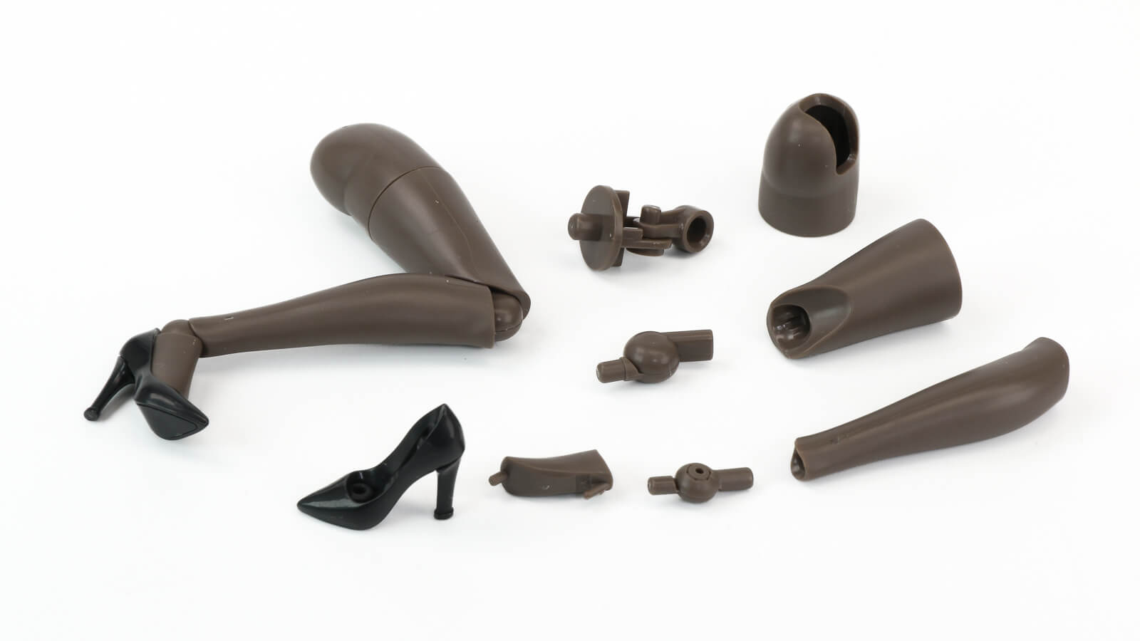 脚部はシンプルに可動部以外は合わせ目がない構造です。いままでのキャラクターでも水着版で魅せてきたワザですね。すごいのはハイヒールで、靴本体、靴底、ヒールの3パーツ構成なのですが、その本物っぽさはなかなか。ちゃんと立てるようにヒールのリフトがちょっとだけ大きいのもプラモとのやり取りを感じる部分です。