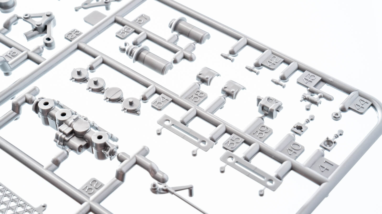 ブレーキディスクにこれだけ穴が開けられるのなら……と考えたかどうかはわかりませんが、本キットのなかでも最大の見どころのひとつに「SE」タイプで装備されるラジエーターグリルがあります。繊細な三角形の穴が美しく並び、縦横に極細の凹線が刻まれているこのパーツは、肉眼で見てもプラスチックでできているとは信じられないほどの造形です。ディテールの密度、ツヤ、エッジの処理があらゆるところで精密にコントロールされていて、「ごく薄い金属板をプレスして作っている」「鋳造されている」「柔らかい素材のなかに硬いメッシュが仕込まれている」といった実物の構造/製法までプラスチックパーツが伝えてくれるのです。