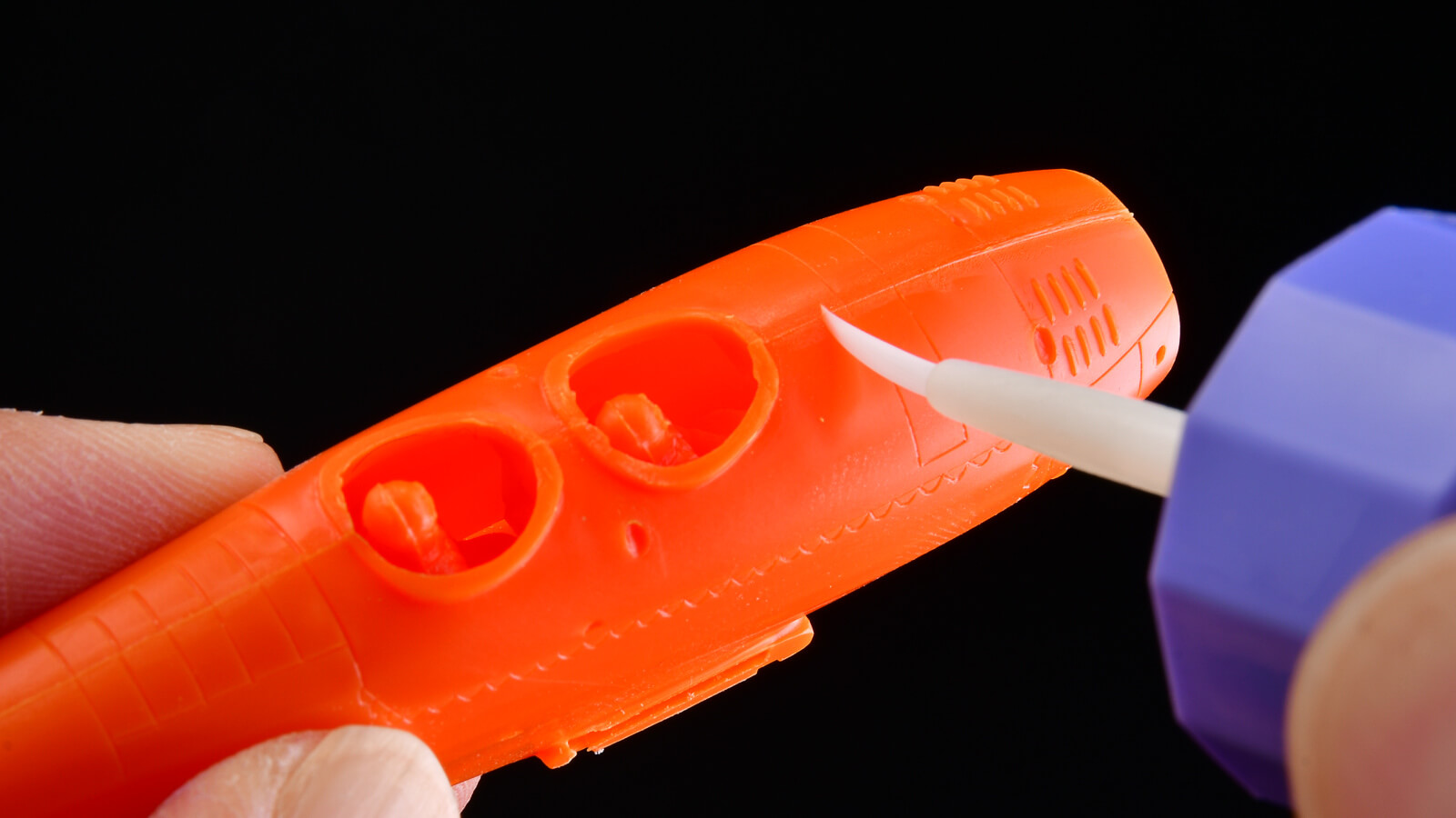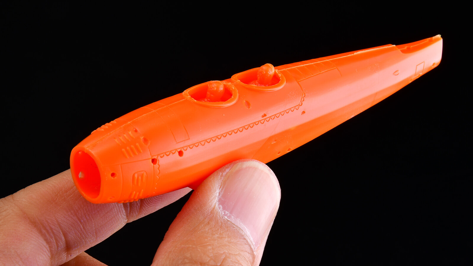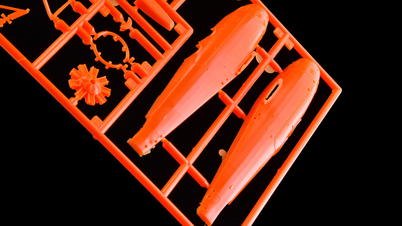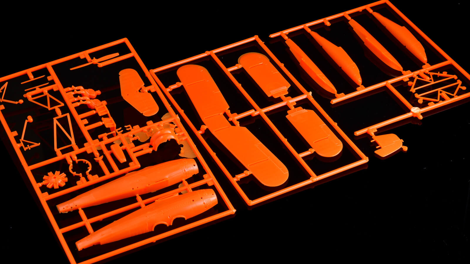 キットのパーツ構成はシンプル。箱を開けた瞬間飛び込んでくるオレンジ色のプラスチックが最高です。少々古いプラモデルなので、バリなどが目立ちますが、デザインナイフで簡単に除去できるレベルです。