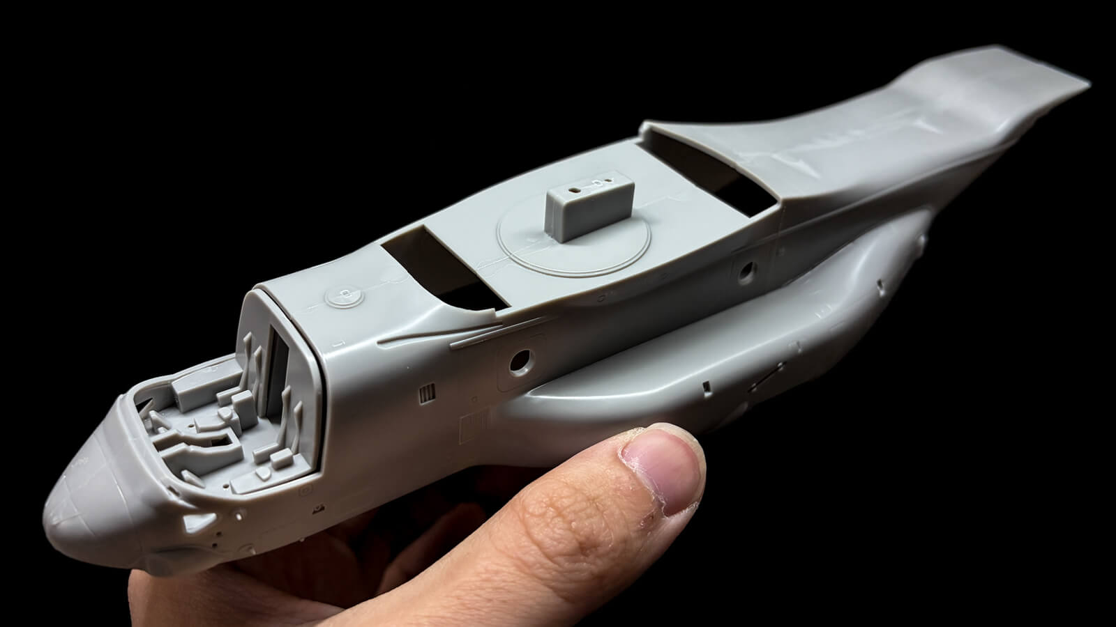 いち早くそのカタチを見たかったので、座席などのコックピット周辺の組み立ては塗りたくなった時におあずけしてフィニッシュ。とにかく派手で大きい機体です。