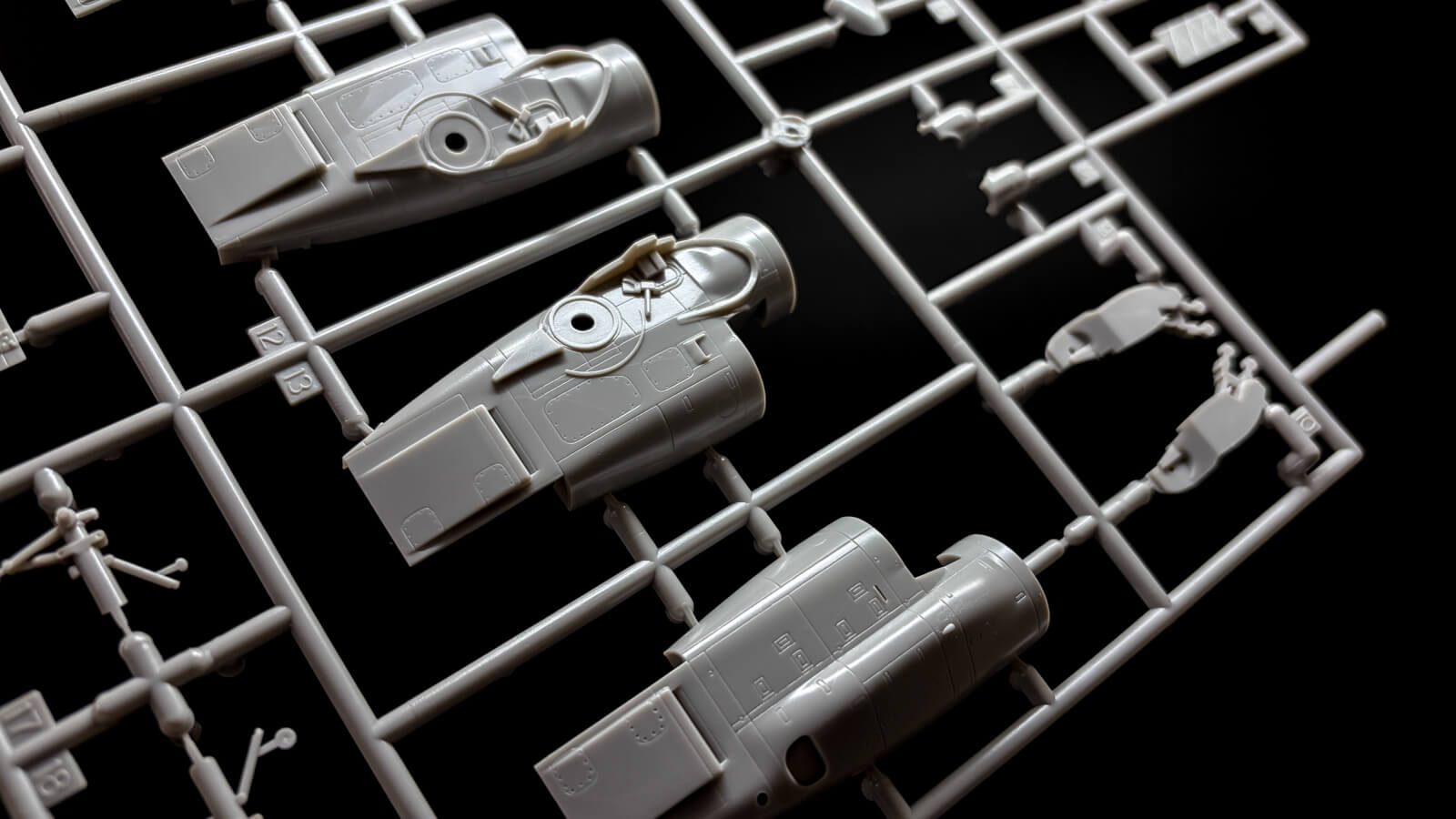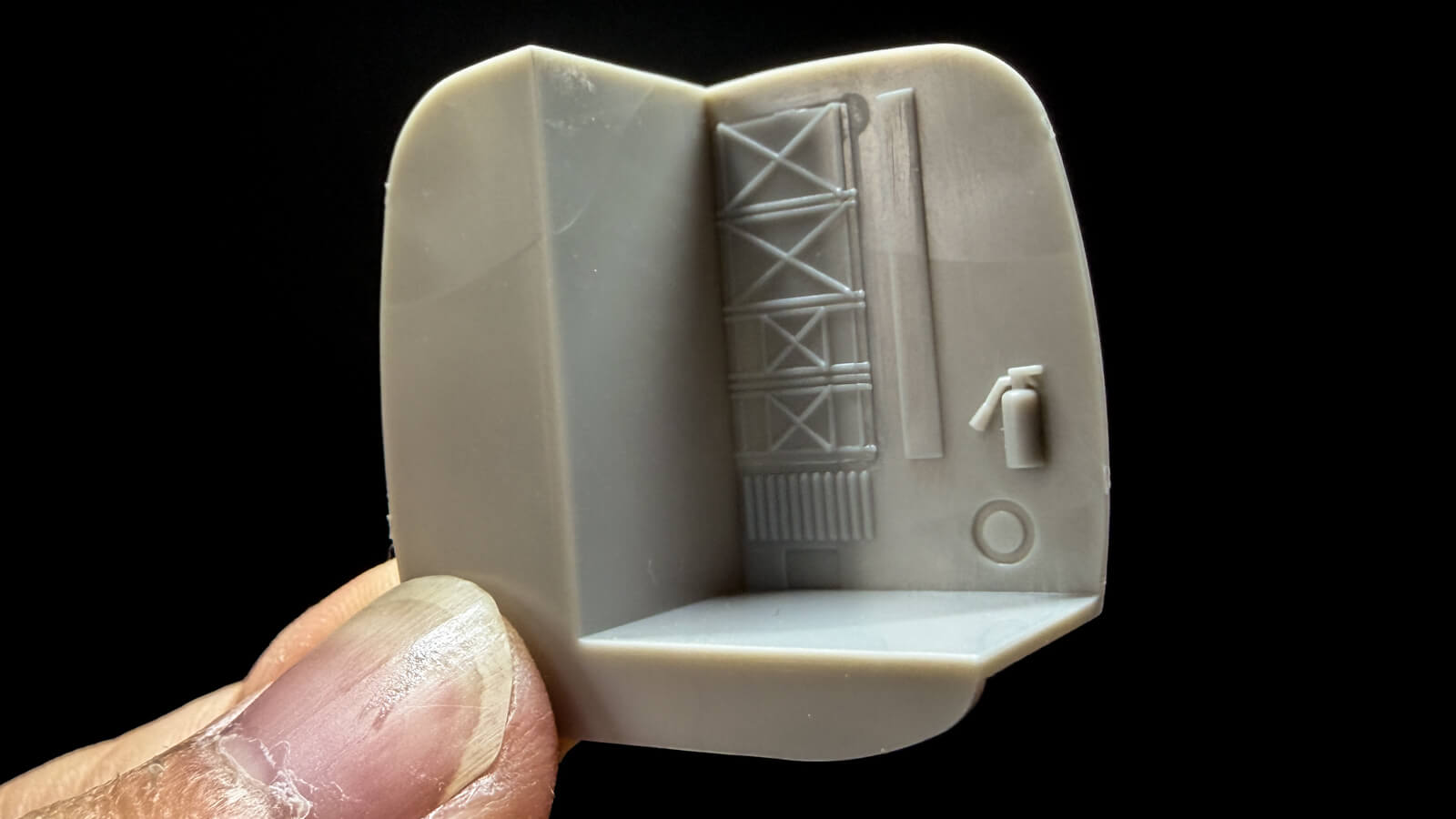 機体に挟み込むパーツには小さな消火器も彫刻されています。組み立てるとほとんど見えなくなるところですが、普段の日常で目にする物があると、この巨大な輸送機の大きさがよりリアルに伝わってきます。