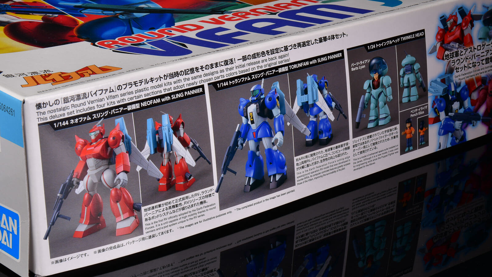 BANDAI SPIRITSは昨今「HGシリーズ」で80年代サンライズメカの主人公機体を発売しています。それと合わせて並べてコレクションしてねという狙いで、今回のような当時キットをセット販売で送り出しています。上の写真がバイファムセット1のもの。こちらの完成見本もすごく良くて、そのまま組んで塗りたくなります。