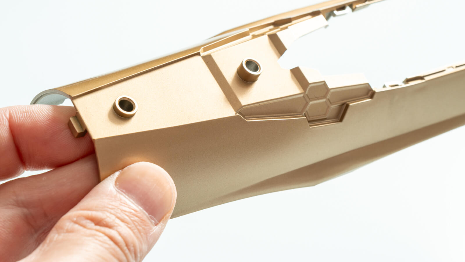 銀河の妖精ことシェリル・ノームの衣装は薄くパープルがかった濃紺で、メタリック粒子が練り込まれたプラスチックカラー。スキントーンや髪の毛のピンクも従来製品とは異なる色調にチューニングされており、プラスチックの色や質感でゴージャスさを演出する気迫に満ちています。